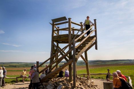 Beschwingt und in Begleitung von Albert Hilt, der es sich nicht nehmen lie�, Interessantes zur Geschichte Rammelfangens zu erz�hlen, setzte sich die Gruppe in Richtung Gallenberg in Bewegung. Von dort hatte man eine herrliche Aussicht, die bei diesem klaren Wetter sogar bis zum Schaumberg reichte. Nun ging es weiter zum Rammelfanger Flugplatz, nat�rlich f�r Modellflugzeuge, und vorbei an bl�henden Wiesen in Richtung Wald, wo uns Albert den seltenen Baum der Elsbeere erkl�rte. Am Hirnberg angekommen, wurde eine kurze Pause gemacht, um den Aussichtsturm zu besteigen und um das weite Land Lothringen zu bestaunen. Nun ging es fast nur noch bergab, zum Teil �ber Treppenstufen durch den in fr�herer Zeit noch vorhandenen Weinberg in Richtung Nachtigallental. Nach einem kurzen Aufstieg erreichten wir den Silwinger Platz und waren wieder in Rammelfangen, dessen Wappen aus bunten Steinchen am Dorfanfang zu bestaunen war.