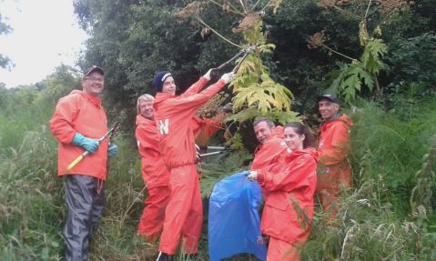 Trotz des seit Jahren erfolgreich laufenden Weideprojekts mit Schafen und Ziegen von �Marie�s Ziegenhof�, hat sich die gef�hrliche B�renklaupflanze auf anderen Fl�chen ausgebreitet. Die Pflanze ist bei uns nicht heimisch und hat hier keine nat�rlichen Feinde, vernichtet aber alle anderen Pflanzen in ihrer N�he. Der Hautkontakt mit den Bl�ttern verursacht in Verbindung mit Sonnenlicht starke Verbrennungen, hier sind besonders spielende Kinder gef�hrdet. Aus diesem Grund hat Ortsvorsteherin Hedi Gro� die B�rgerinnen und B�rger gebeten sich an der Entfernung dieser Herkulesstaude, wie sie auch genannt wird, zu beteiligen. So trafen sich Ortsratsmitglieder und engagierte B�rger am vergangenen Donnerstag um die schon im Samen stehenden Bl�tenk�pfe zu entfernen. Mit Schutzanz�gen und Astscheren k�pfte die Truppe ca. 100 Pflanzen, sammelte sie in einem Traktoranh�nger, um sie anschlie�end zu verbrennen. Leider wurde sp�ter noch ein gro�es Feld entdeckt, in dem sich die Pflanze stark ausgebreitet hat, hier sollte man auch an die Eigent�mer appellieren sich um die Entfernung zu k�mmern, da das allein mit B�rgerengagement nicht zu schaffen ist. Durch die Unterst�tzung des Umweltamtes konnte die neuentdeckte gro�e Fl�che noch abgesammelt werden.